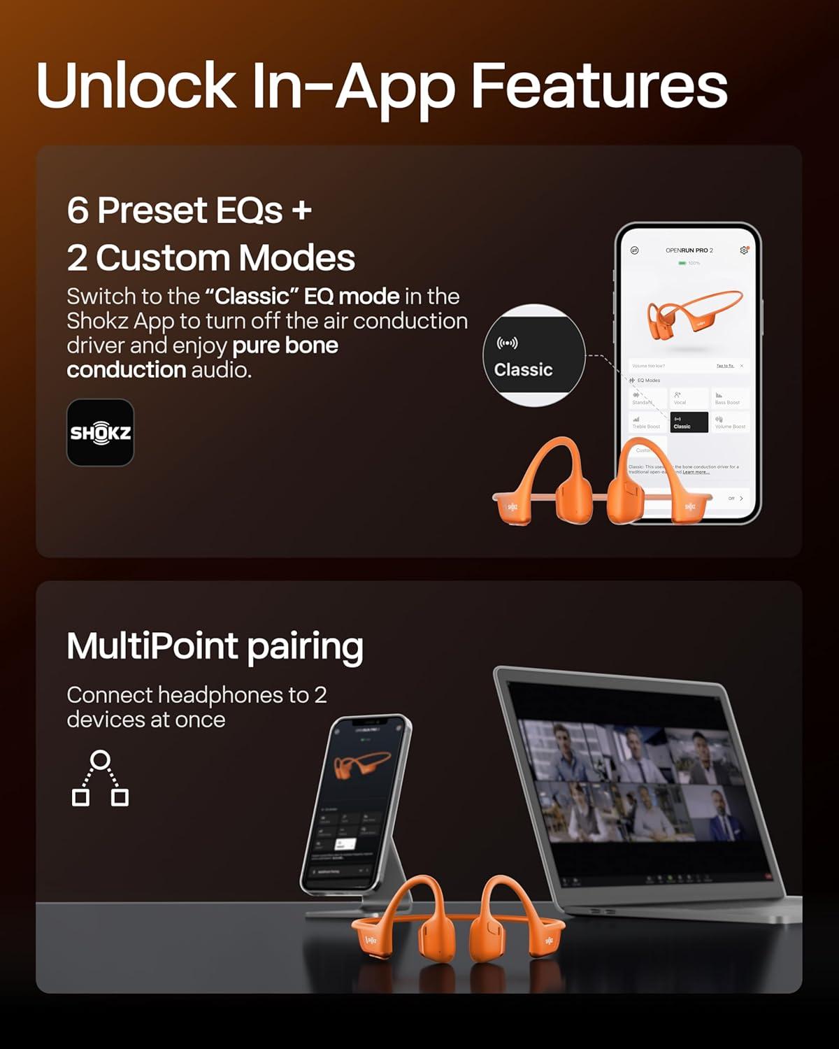 Dedicated EQ Modes – Customize your audio experience with our dedicated EQ modes on the Shokz App. Enjoy pure bone conduction sound with the newly launched Classic Mode, or boost your audio in noisy environments with Volume Boost Mode.