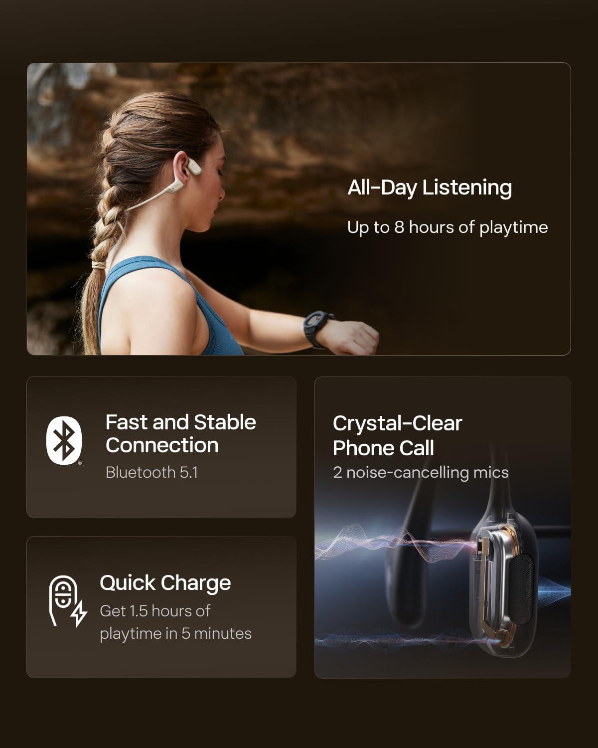 10 Hours of Music & Calls – Enjoy ten continuous hours of music, calls and podcasts with our Bluetooth headphones. OpenRun Pro also features a 5-minute quick charge for up to 1.5 hours of battery life